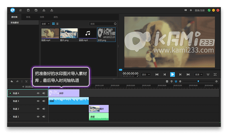 为剪辑的视频添加水印。想要为轨道上制作的视频添加水印,首先准备好水印图片,背景最好是透明的,导入素材库,并导入到时间轴轨道,水印所在的轨道,要在其他素材所在轨道的上方,如图1所示
