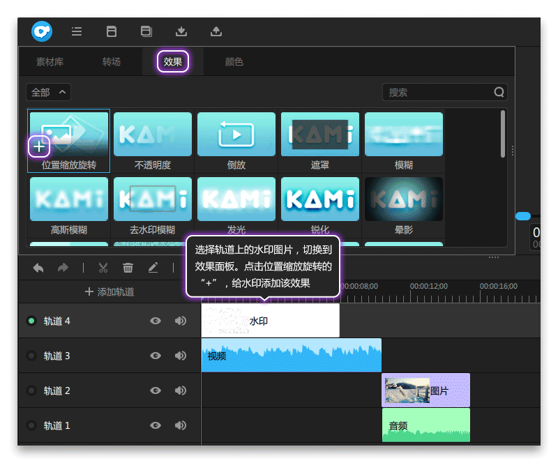 选择轨道上的水印图片,切换到效果面板,点击位置缩放旋转的“+”,给水印添加该效果,如图2所示。