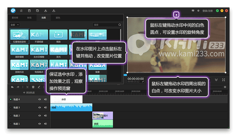 保证选中添加效果的水印,观察操作预览窗;鼠标左键拖动水印四周出现的白点,可以改变水印大小;鼠标左键拖动水印中间的白色圆点,可设置水印旋转角度,在水印图片上点击鼠标左键并拖动,改变图片位置。如图3所示。