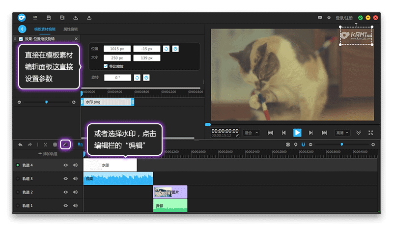 或者选择水印,点击编辑栏的“编辑”,来到模板素材编辑面板,直接设置水印的位置大小旋转等参数,观察预览窗,水印图片位置和大小就设置好了,如图4所示。