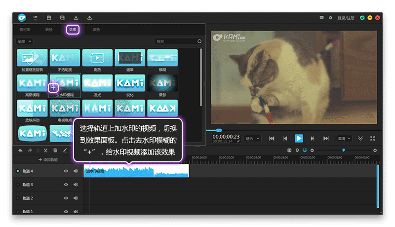 接下来讲解去除水印。把有水印的视频导入素材库,导入轨道,选中素材,切换到效果面板,点击去水印模糊的“+”,给水印视频添加该效果,如图5所示