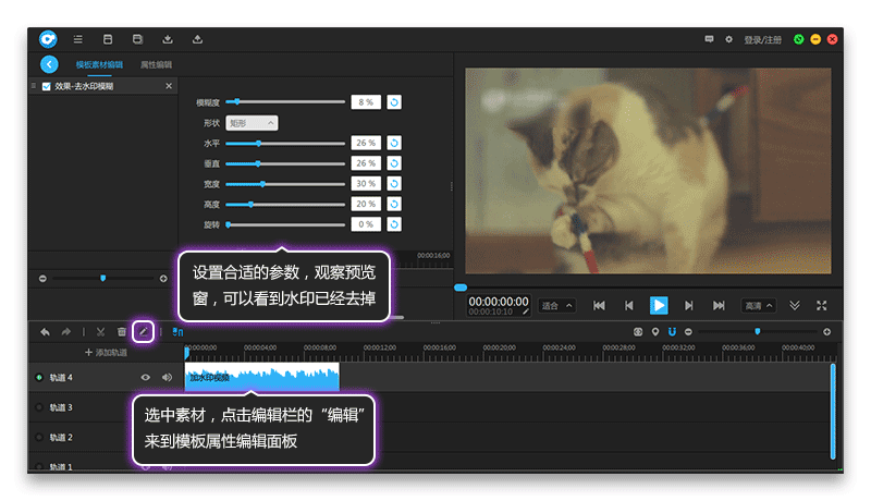 选择视频,点击编辑栏的“编辑”,来到模板素材编辑面板,直接设置去水印模糊的参数,模糊度是设置模糊的程度,水平垂直设置模糊的位置,宽度和高度设置模糊的大小,其他的参数可以不用理会了,如图6所示。