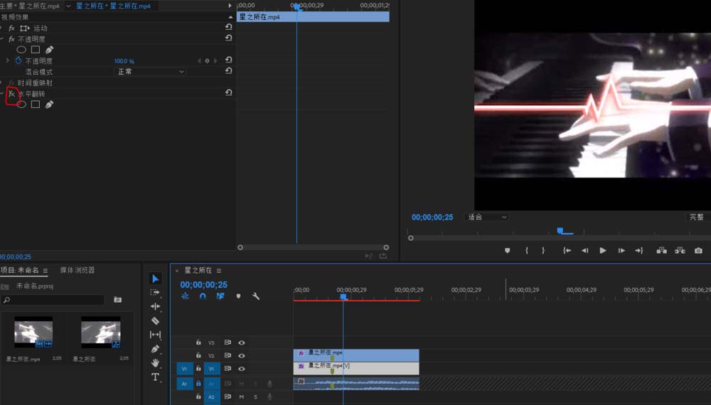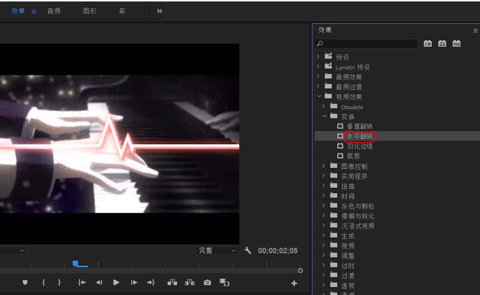 3、找到效果——视频效果——变换——水平翻转,按住拖到视频上
