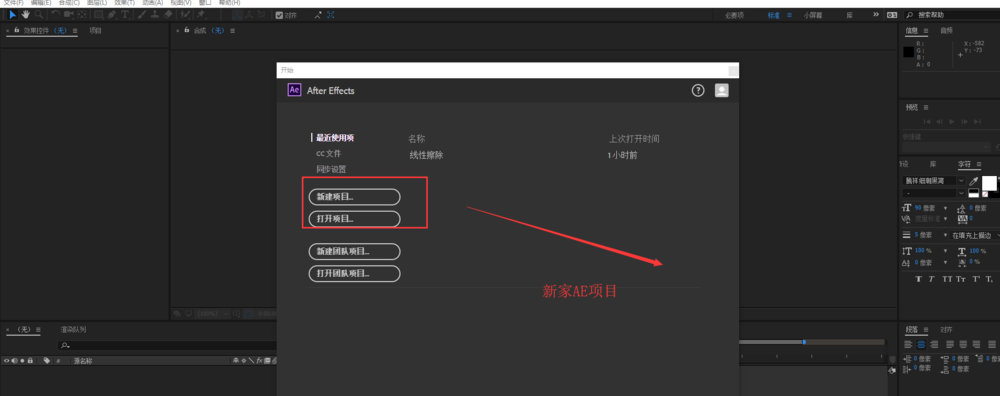 1、启动AE软件之后,在开始页面中选择单击新建项目,有的人打开AE之后可能没有开始界面,那么直接在文件菜单中新建项目即可。