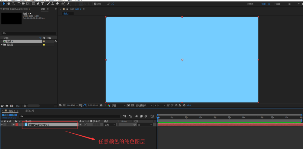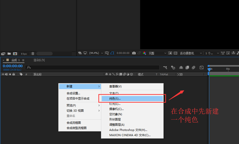 2、在AE合成的图层管理窗口空白处,右键鼠标,然后弹出右键鼠标选项,在右键选项中选择新建中的纯色(比较低的AE版本叫固态层)。