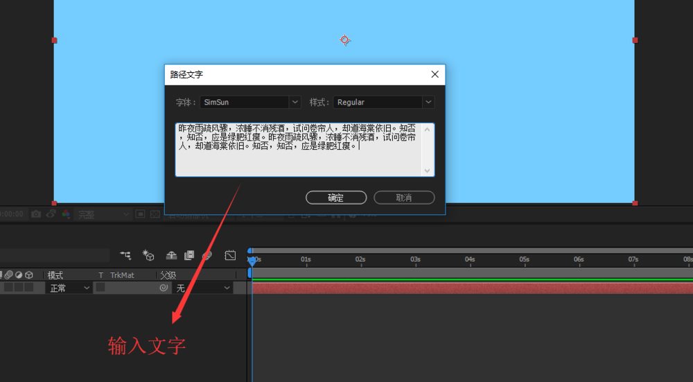 5、单击路径文本之后,会打开路径文字窗口,在路径文字中输入文本内容,这里我就随意输入了一些文字。点击确定。