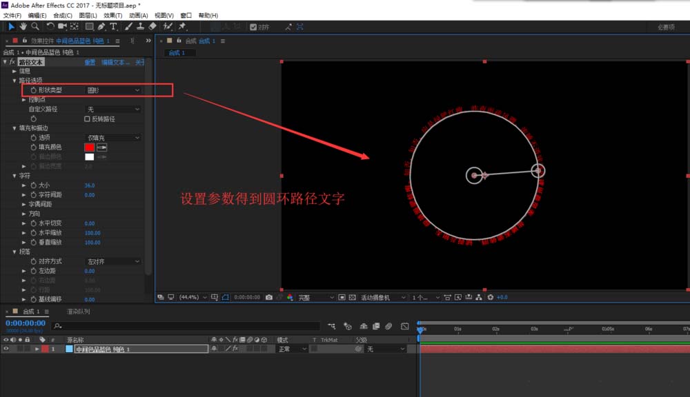 6、在路径文本效果中选择形状类型为圆形,其他参数大家也可以根据需要进行选择调整,在调整圆形的控制柄达到最终圆形路径排版文字效果。