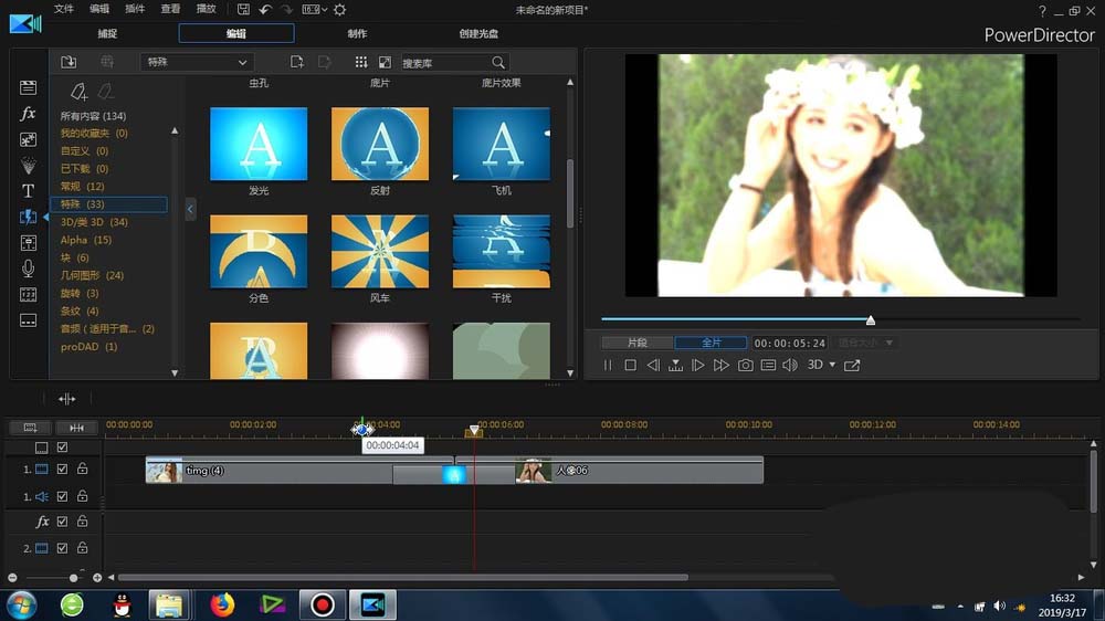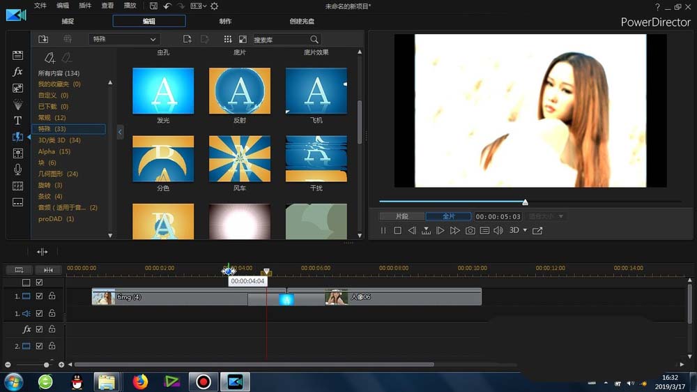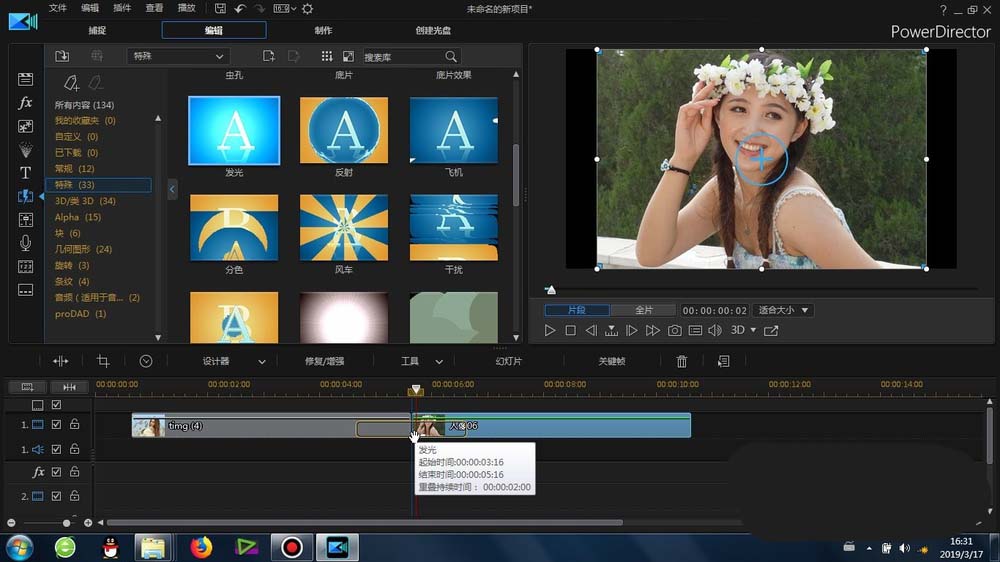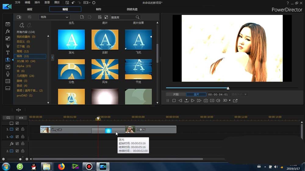 1、这里的“发光”转场是在威力导演里面的-转场-常规-里面可以找到