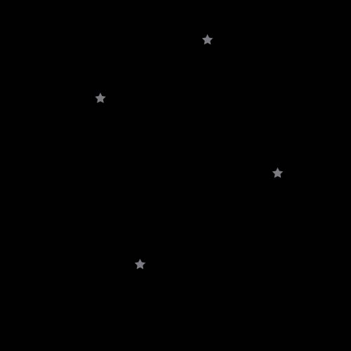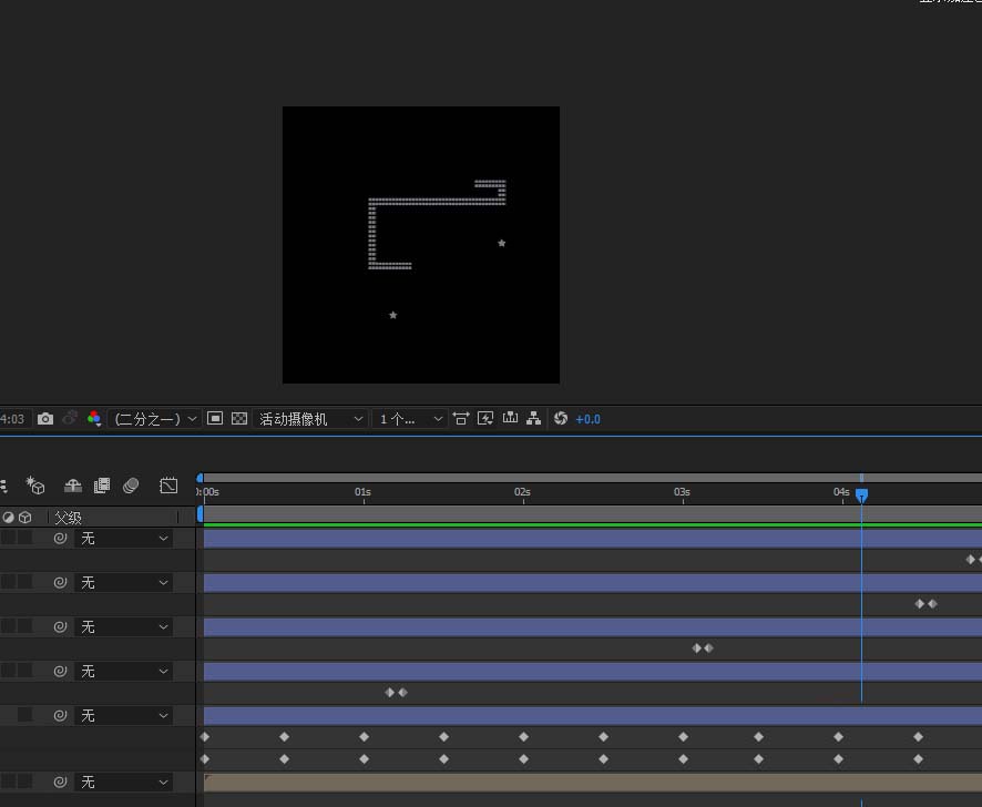 4、选中星形工具画个五角星作为食物,多复制几个放在不同地方,然后给不透明度k关键帧,蛇经过之后食物被吃掉,透明度开始为100,吃掉之后就是0了。其他食物以此类推,然后蛇在吃了食物之后变长,所以这个时候路径的开始和结束的差值要变大,来体现出蛇变长了。