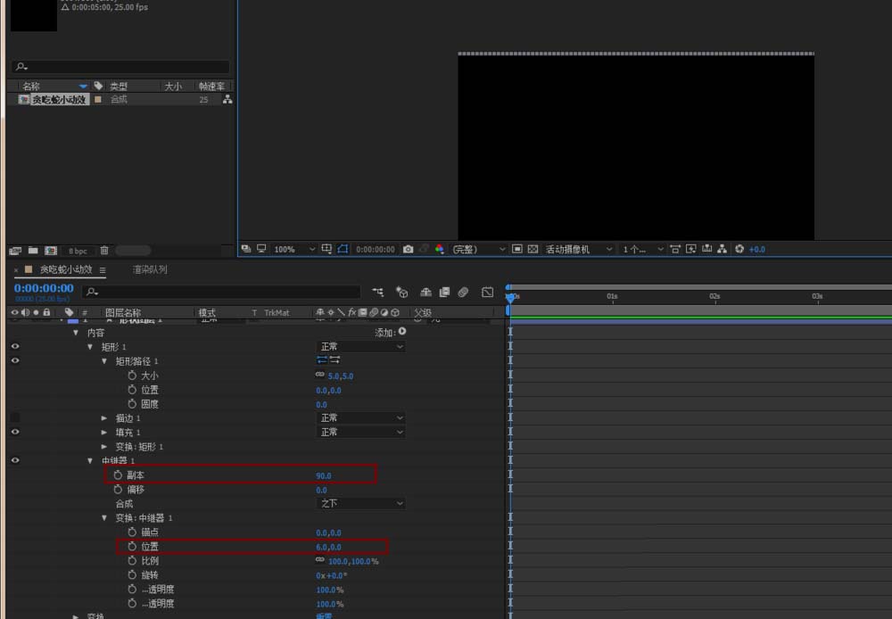 2、选中矩形形状工具,画一个5*5的小矩形,然后点击旁边的小三角添加中继器,数量设置了90,把横向方向填满,每个小矩形的间隔设置为6.做好一个之后选中形状图层CTRL+D复制多层,直到将整个画面有规律的铺满为止,然后将所有的形状图层CTRL+SHIFT+C预合成。