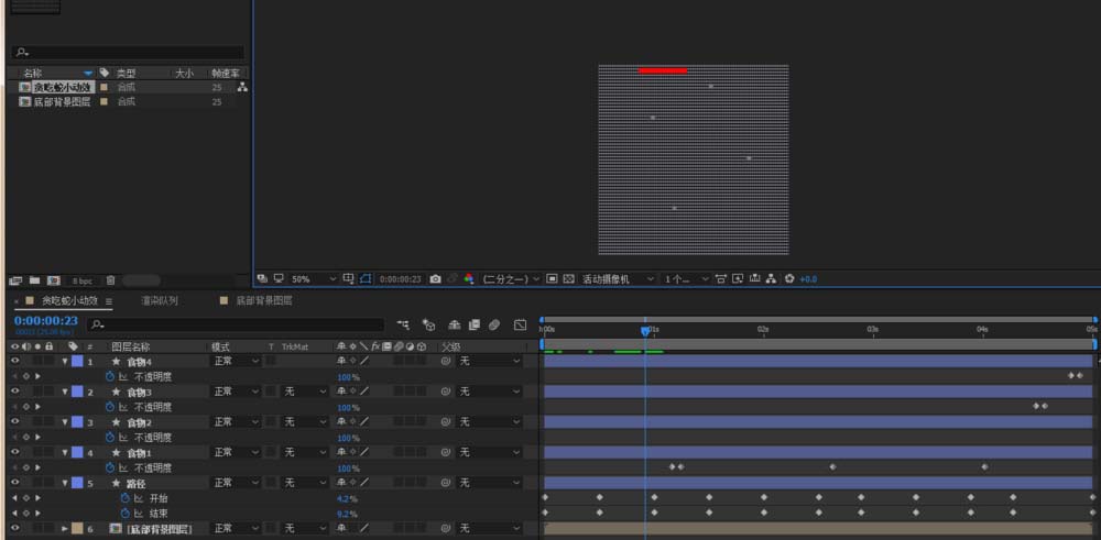 5、这个时候我们将背景层的设置Alpha蒙版,这样效果看起来就更舒服更像经典贪吃蛇小游戏了,此时按下空格键,整体效果就已经做好了。