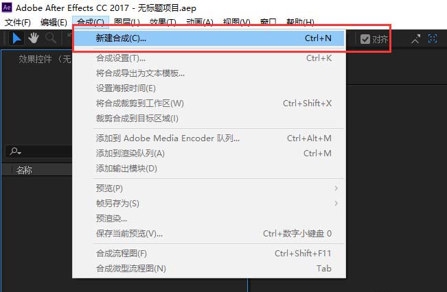 1、双击Adobe After Effects软件的快捷图标启动打开这个软件,进入到AE软件编辑界面,在合成中找到新建合成命令。
