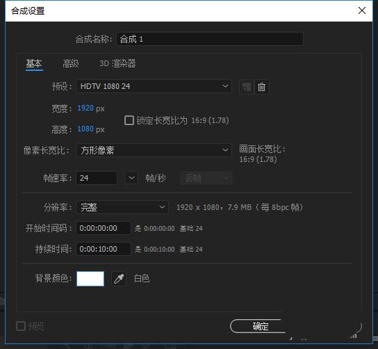2、弹出合成设置的窗口,在合成设置窗口中设置合成的大小为1920*1080像素,像素长宽比为方形,帧速率为24.然后单击确定来创建AE合成。