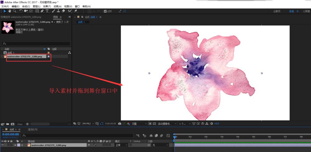 3、在AE项目窗口空白处双击鼠标导入一个透明背景色图片素材,即.jpg 格式的图片,并将该图片拖入舞台窗口中。
