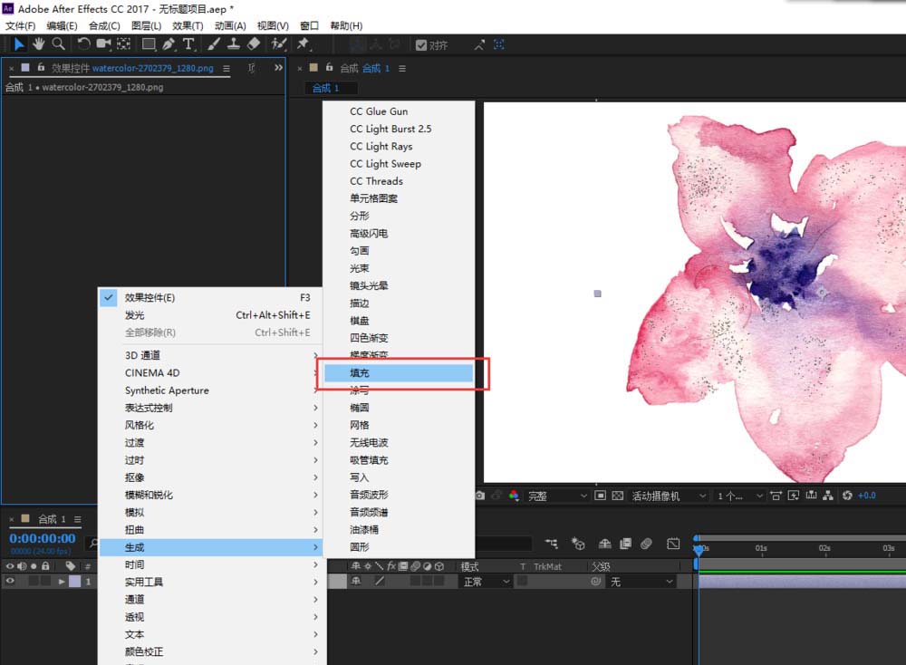 4、选中透明背景图片素材,找到效果控件窗口,在该窗口右键鼠标选择并执行生成中的填充效果。