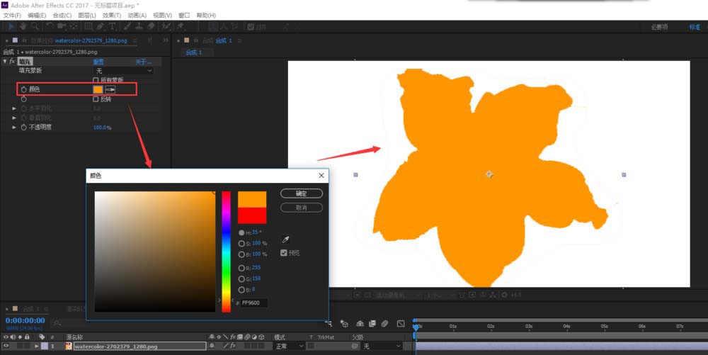 5、添加了填充效果之后,在效果控件中单击填充的颜色色块,会弹出“颜色”对话框,在颜色对话框中选择一个你喜欢的颜色,这个颜色就是填充素材的颜色。