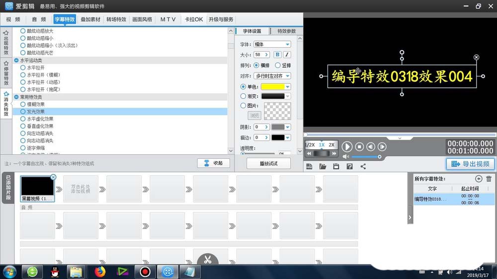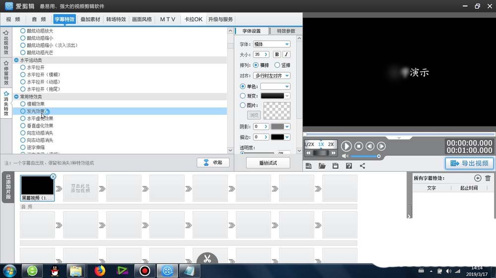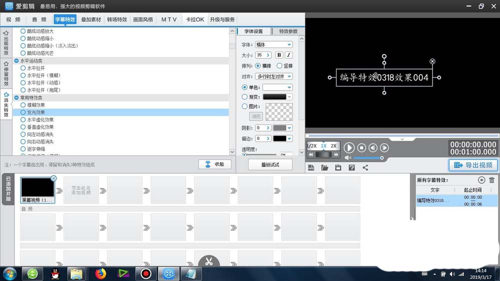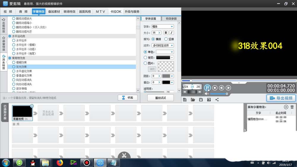 1、这个发光消失效果的存在位置是:字幕特效-消失特效-常用特效类,一定要找到