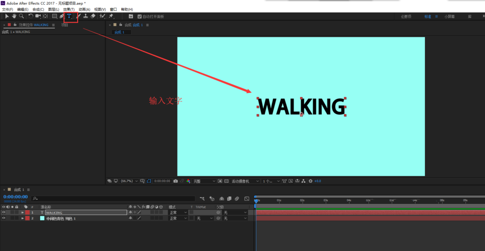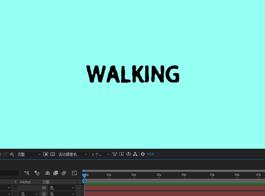 4、选择文字工具,在合成1预览窗口单击并输入“WALKING”文字内容,然后选中文字设置其属性与对齐方式让文字置于中央位置。