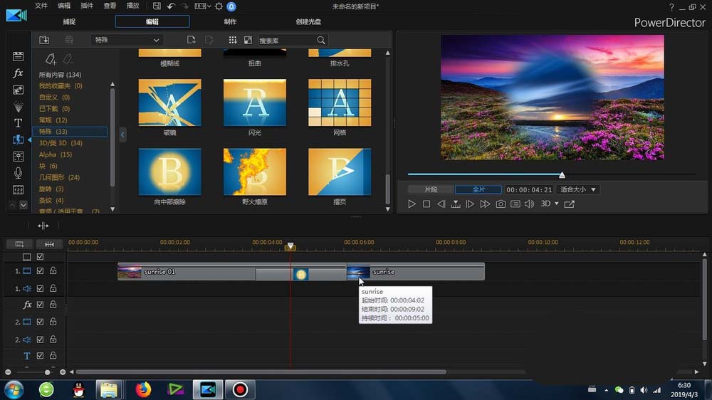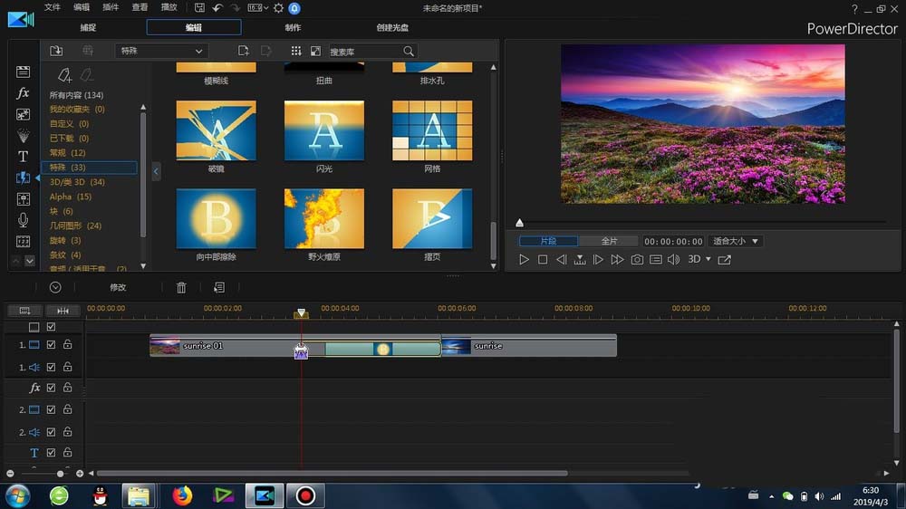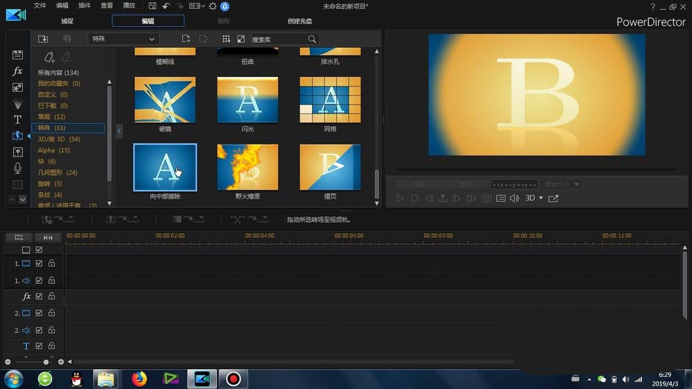 1、这里的“中间擦除”转场是在威力导演里面的-转场-特殊-里面可以找到