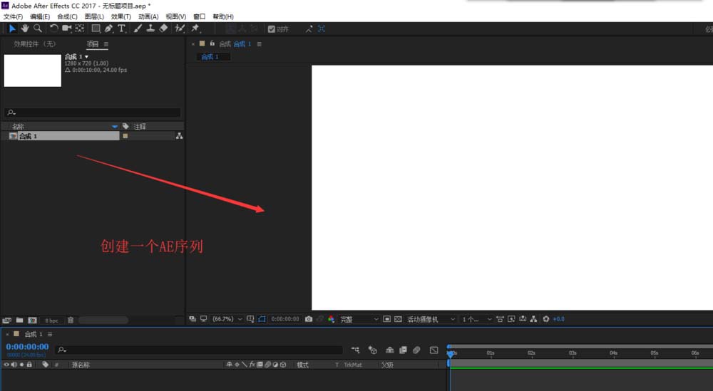 1、新建一个After Effects项目,然后在这个新建的空白项目中执行创建合成操作,来创建一个合成1.