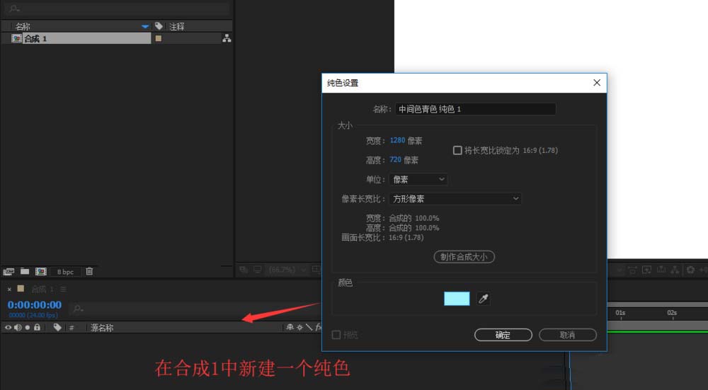 2、在合成1右键单击鼠标,选择新建纯色,弹出纯色设置窗口,单击纯色设置的色块更改一个颜色作为合成的背景颜色。