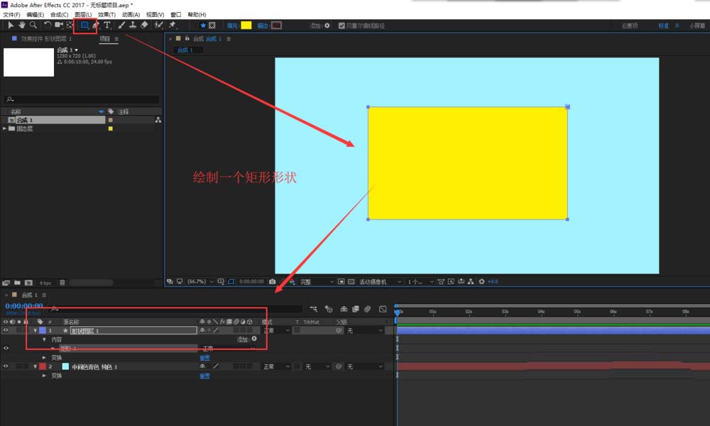 3、鼠标在合成1的图层空白处单击一下,然后选择矩形工具,在合成1的预览窗口中绘制一个差不多的矩形图形出来。