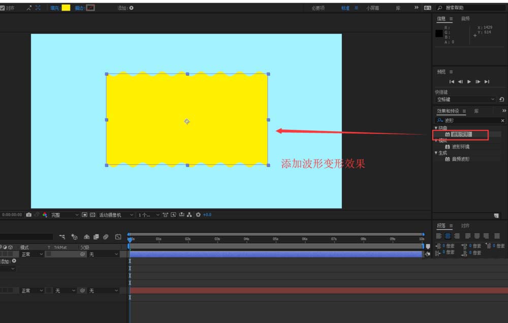 4、选中这个绘制的矩形,在AE内置效果中搜索找到扭曲中的波形变形内置效果,并将这个波形变形的效果施加给矩形图形。