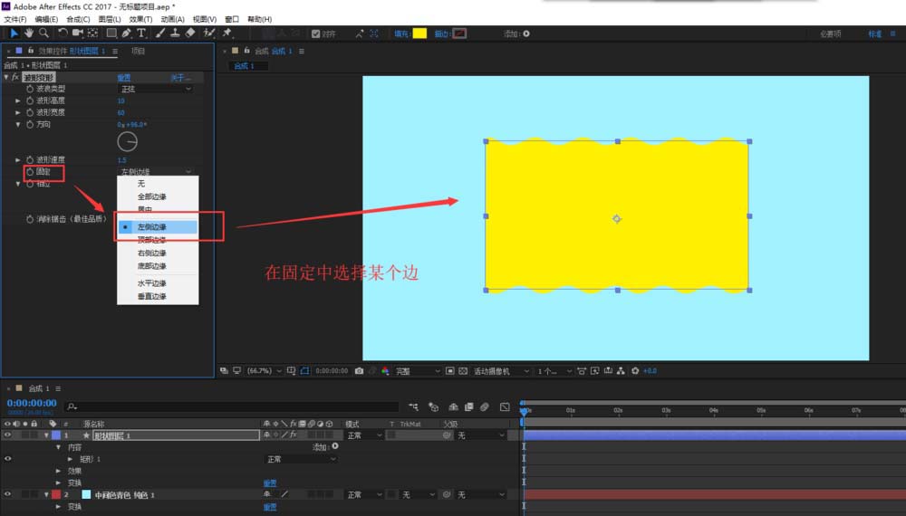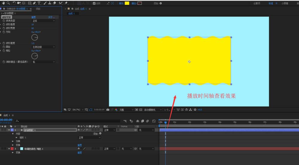 6、设置完成之后,可以播放时间轴预览查看After Effects动画效果,我们可以看到我们设置固定的那一个边就不会产生波形变形效果了。