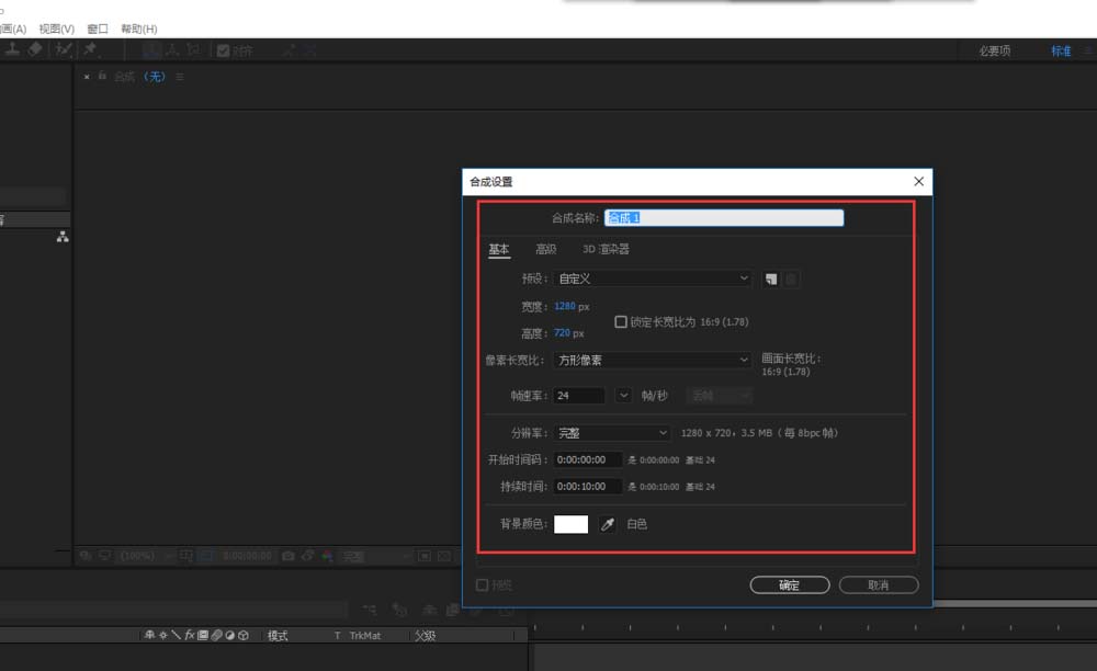 1、在打开的Adobe After Effects软件单击新建合成按钮,打开合成设置窗口,选择设置一个合成进行创建。