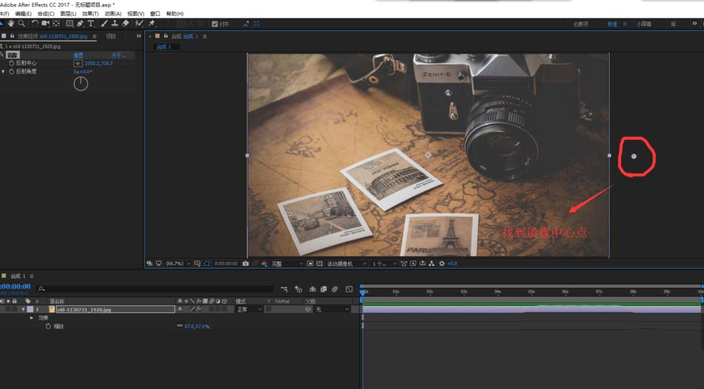 6、直接移动中心点或者在效果控件中通过反射中心的参数来调整中心点的位置,将中心点移到图片中心位置,这时候我们就看到图片以中心点左右镜像的效果了。