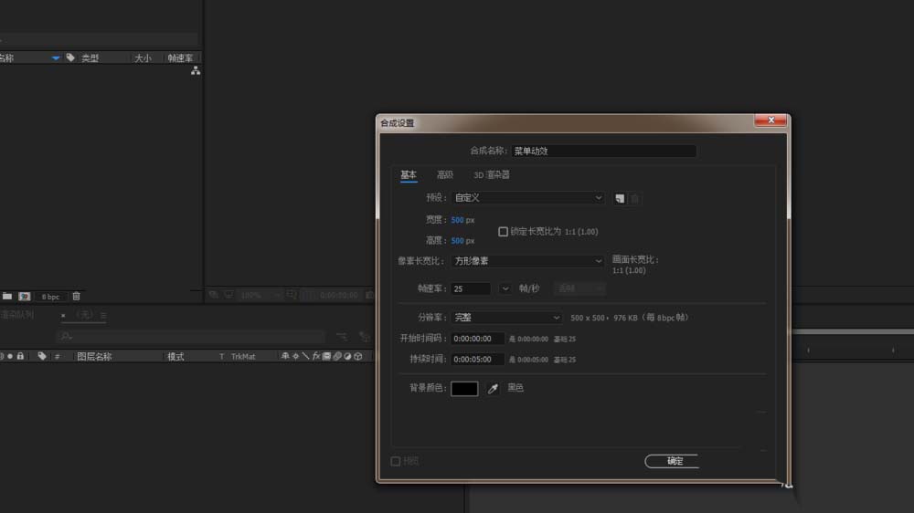 1、打开AE软件,命名菜单动效,调整相应的参数。