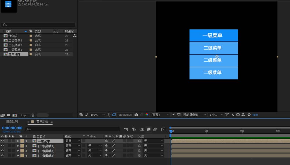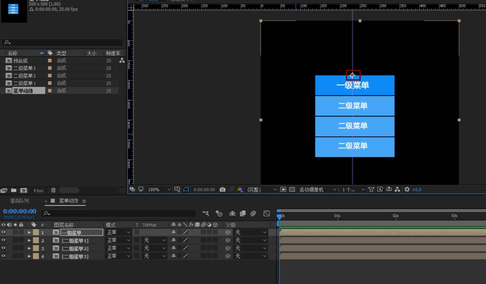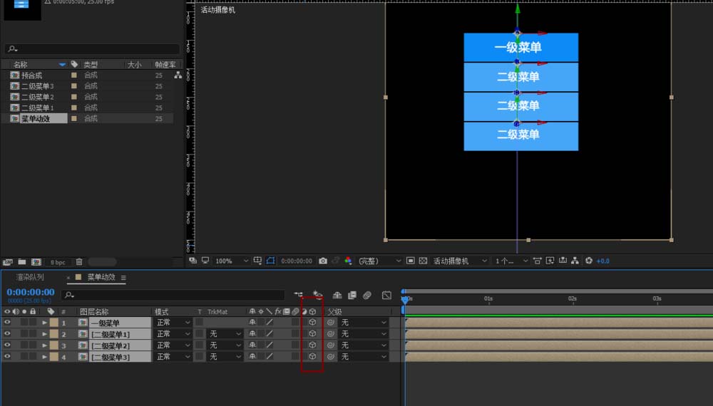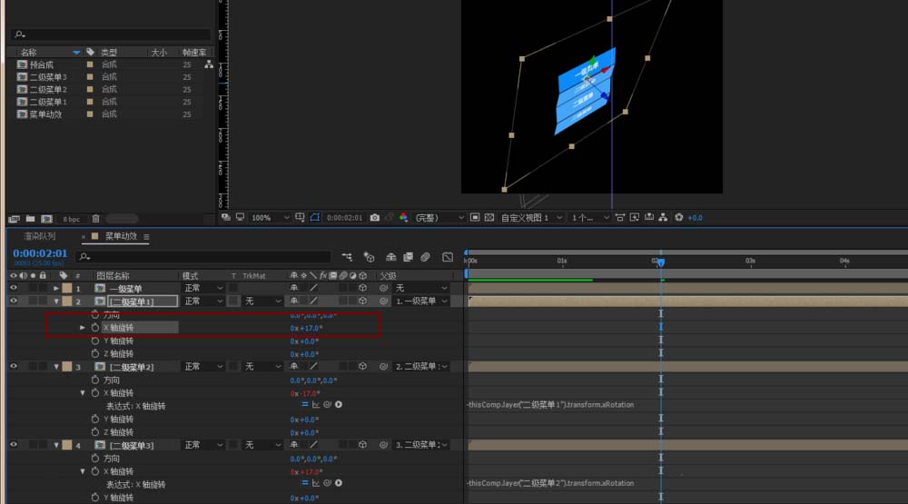 3、然后将四个图层的锚点分别调整至上边中间区域,然后选中四个预合成,打开图层3D模式,同时都打开旋转属性,接下来建立父子级关系,将二级2为二级3的父级,二级1为二级2的父级,一级为二级1的父级,然后将点击二级菜单3下的的x轴前面的小码表的同时按住Alt,调用出表达式,然后将表达式关系器连接到二级菜单2的下的X轴上,让二级菜单2成为二级菜单3的父级,同理操作,将二级菜单2的父级选为二级菜单1。
