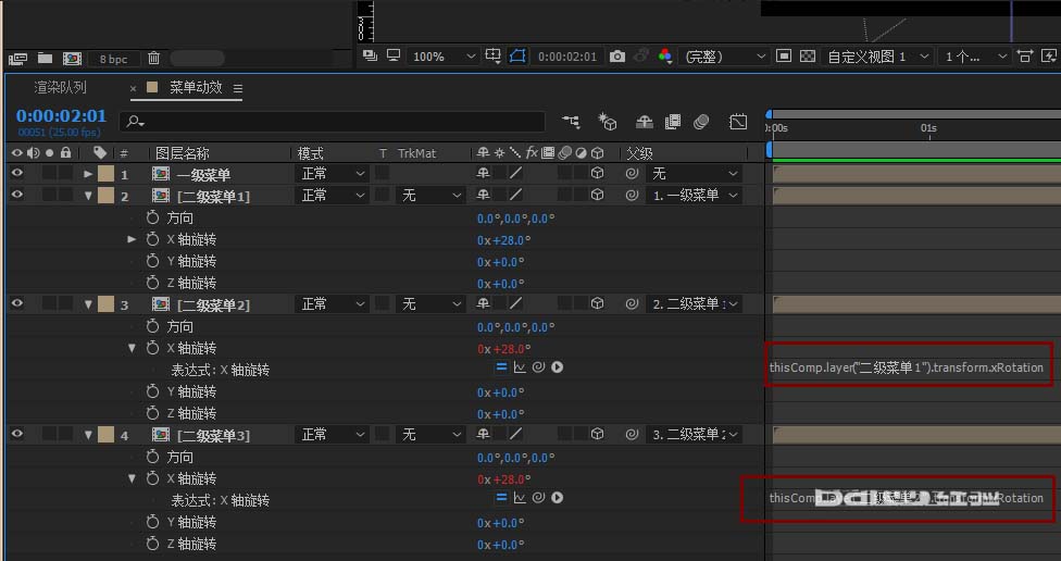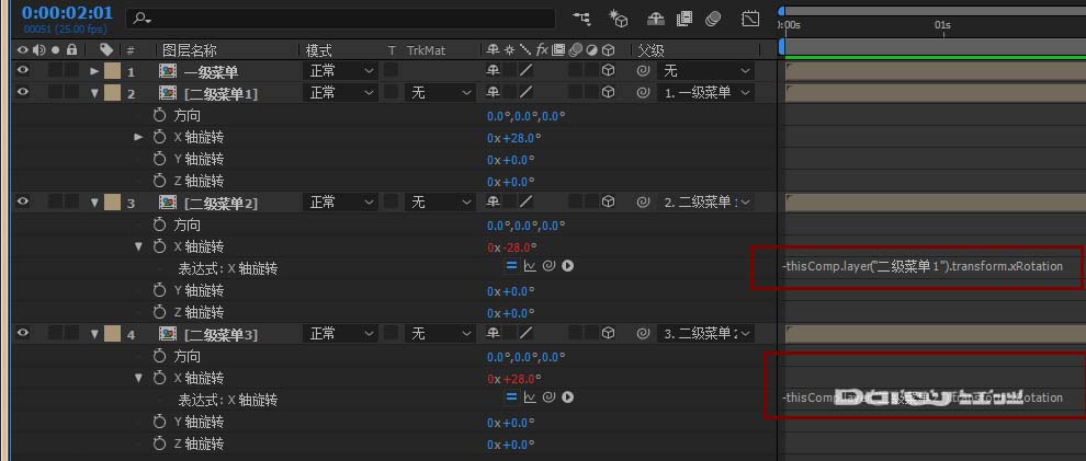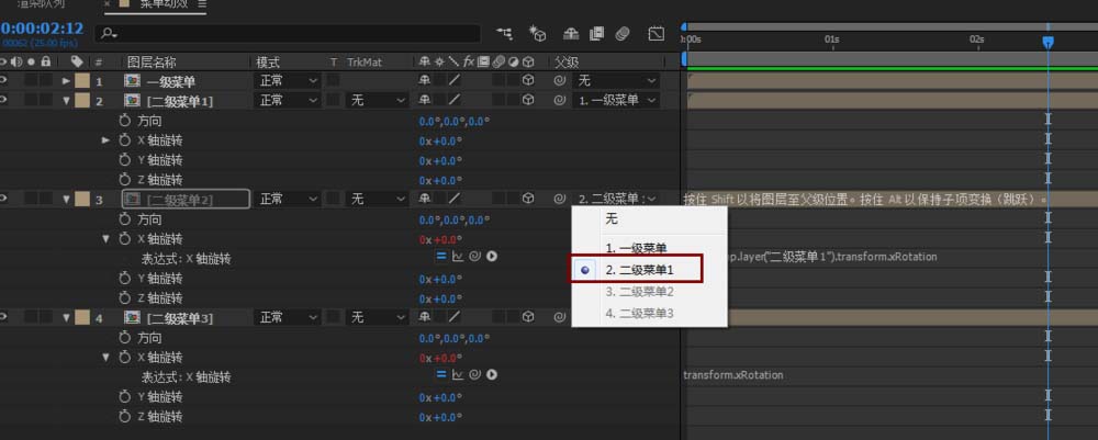4、建立父子级之后,对应的表达式框里面会出现如图代码,这个时候我们需要简单的修改一下代码,在现有代码前面添加一个‘-’就行了,变成-thisComp.layer("二级菜单1").transform.xRotation,这个操作的作用是让子级的旋转方向和父级的旋转方向相反。