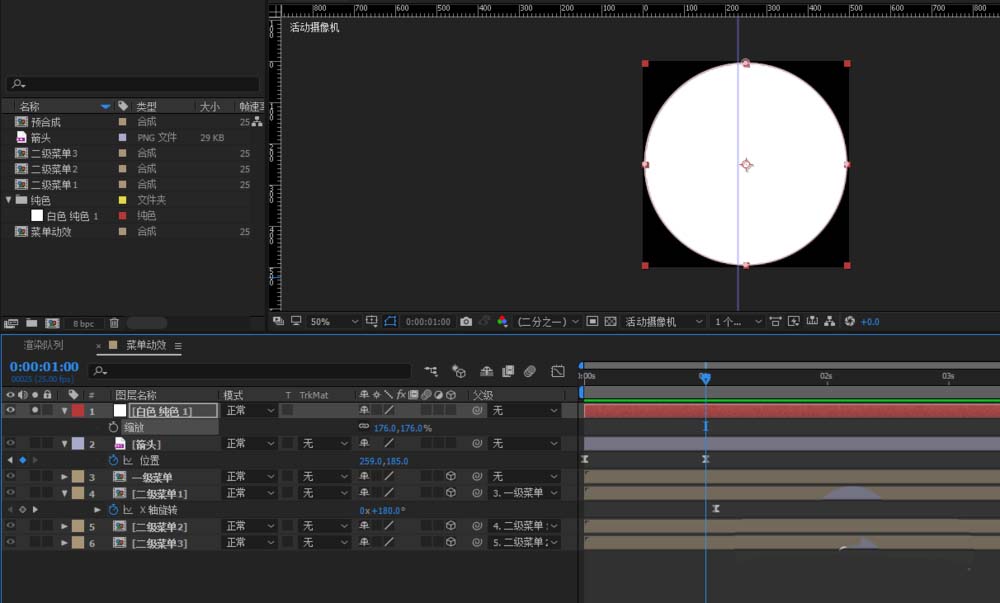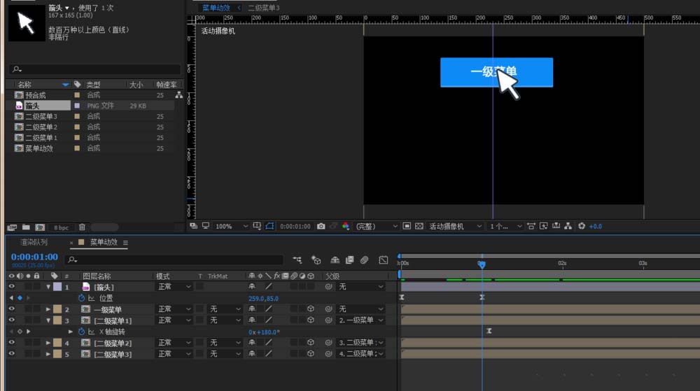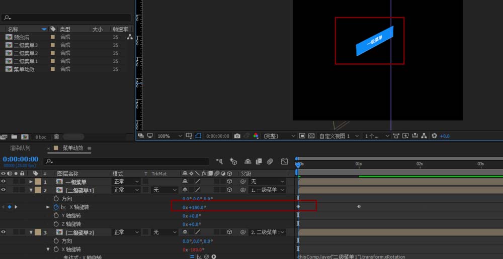 6、给二级菜单1的x轴旋转角度K关键帧,第一帧将三个下拉导航隐藏起来(180°),第二帧恢复垂直下拉状态(0°),这个时候按下空格键预览就有一下菜单下来的效果了,选中所有关键帧按下F9来个缓动,这样效果比较缓和自然。