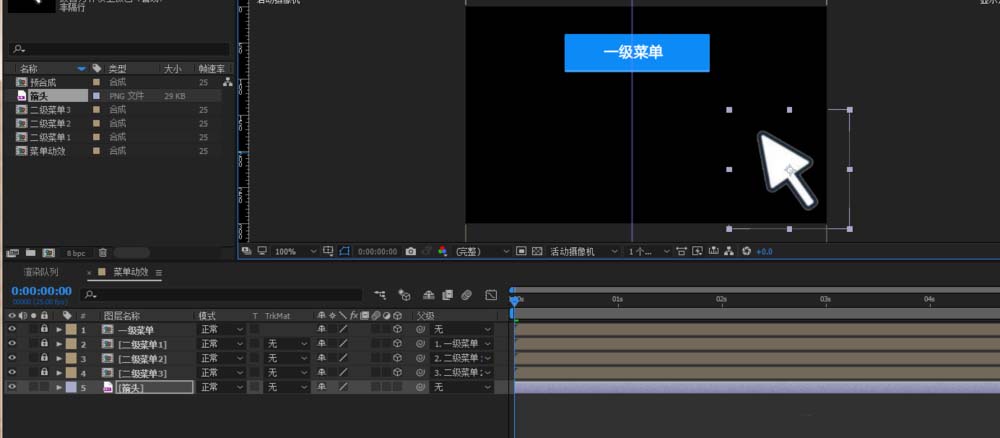 导入一个箭头素材,或者自己用钢笔工具绘制也行,我们需要实现鼠标点击一下,展示下拉菜单的效果,所以我们这边给箭头做个位置动画,先拉出画布外,再移到一级菜单那,把下拉的效果和箭头出现的时间错开来。