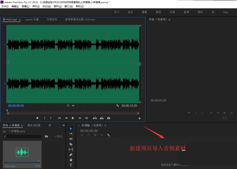 1、打开PR新建一个剪辑项目并进入到PR软件中,然后知道导入命令来选择一个音频进行导入到PR中。