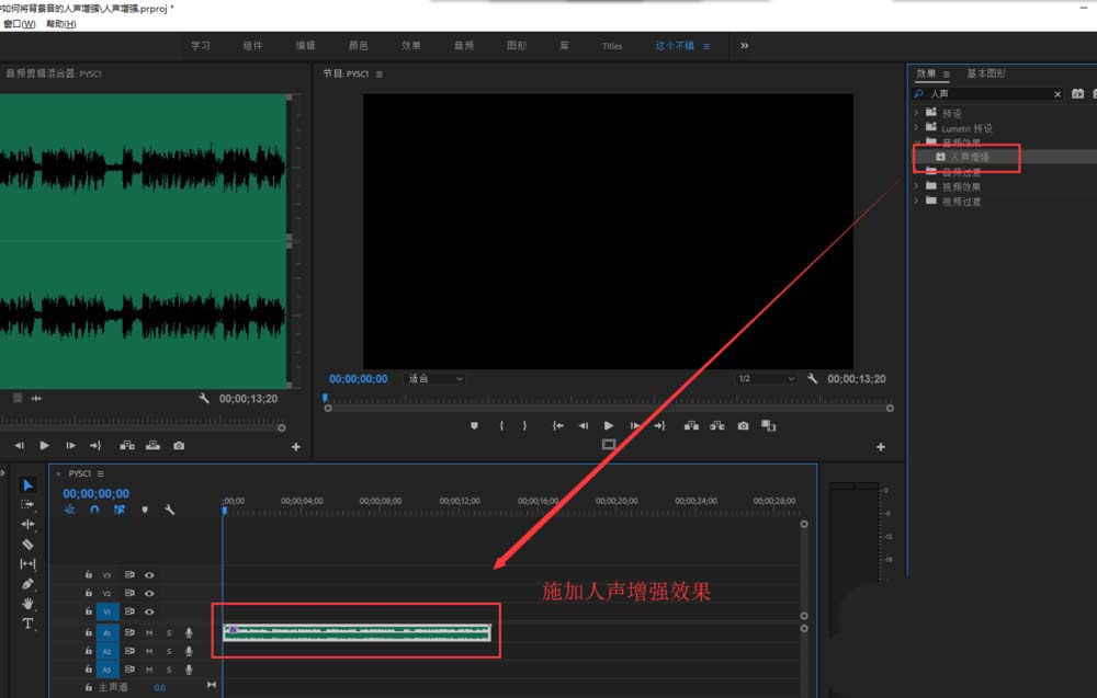 3、打开效果窗口,在效果中搜索得到“人声增强”这个效果,将这个效果给音频素材添加。
