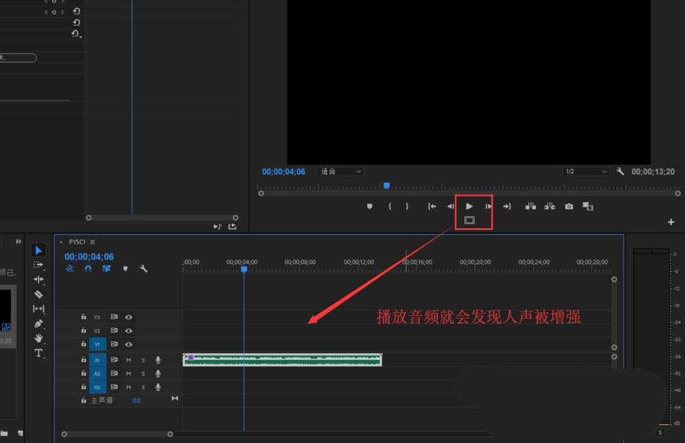6、最后我们来播放时间轴,听一下最终的效果,和开始的原素材音频进行对比,会明显感觉到人声被增强了。