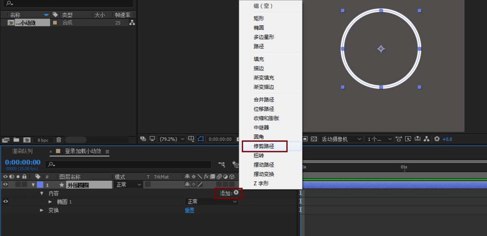 3、打开属性,点击旁边的添加,给圆圈添加修剪路径,然后给开始和结束,偏移量的值k关键帧,开始的值(0,25,50,80,100)结束的值(0,30,50,70,100)偏移的值(0,270)这些只是供大家去参考,具体可以根据实际去调整。选中所有关键帧,F9来个缓动。