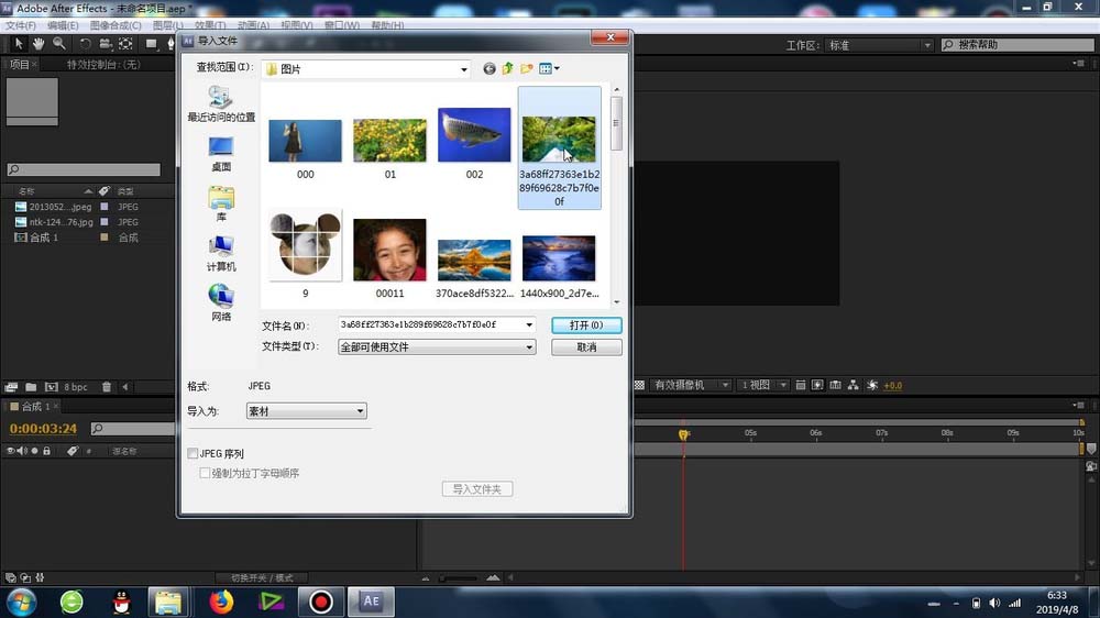 1、首先就是素材的导入,这个导入的方法很简单,不再赘述,将素材库的素材拉至合成里面的时间线上