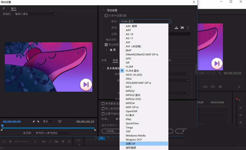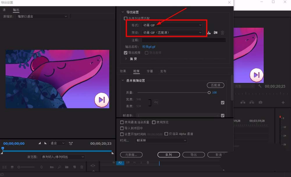 5、格式设置为GIF后,预设选项会默认设置为——动画GIF匹配源,这样GIF的文件分辨率大小就会和原视频相同,GIF文件会较大。