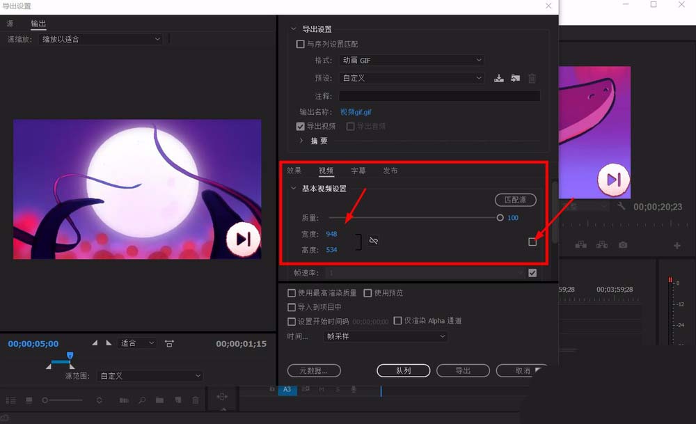 6、如果我们需要修改GIF动图的分辨率大小,可以在视频设置中,取消宽度、高度后面的勾选符号,这样我们就可以自由调整GIF的分辨率大小。