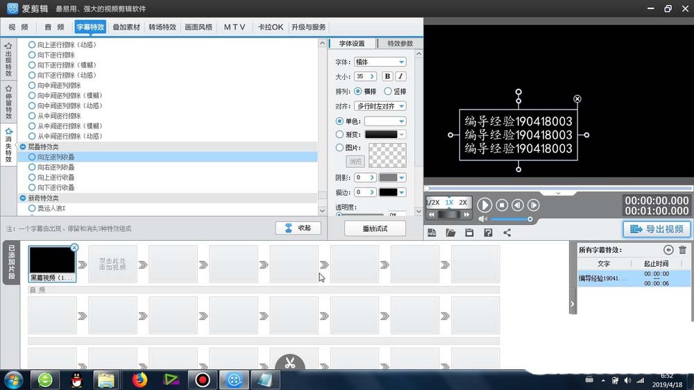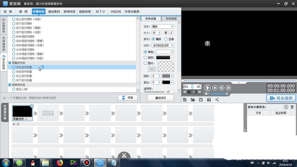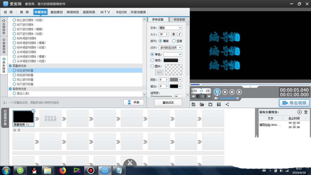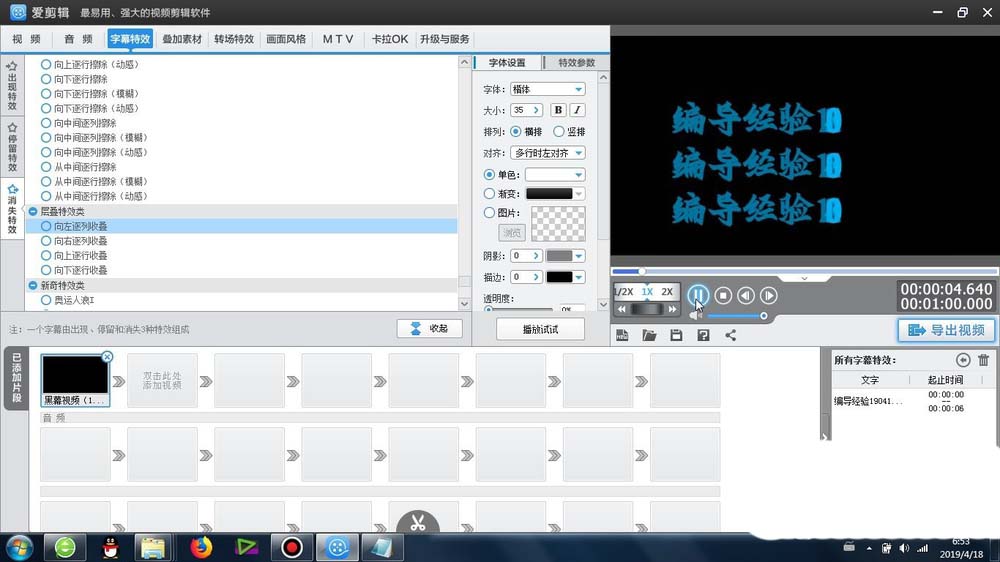 1、首先这个向左逐列收叠效果 -是在爱剪辑里面的字幕特效-消失特效-层叠特效类-可以找到