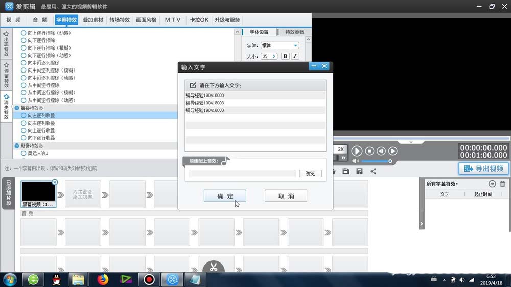 3、输入文字,确定之后,文字就会出现在视频预览区域