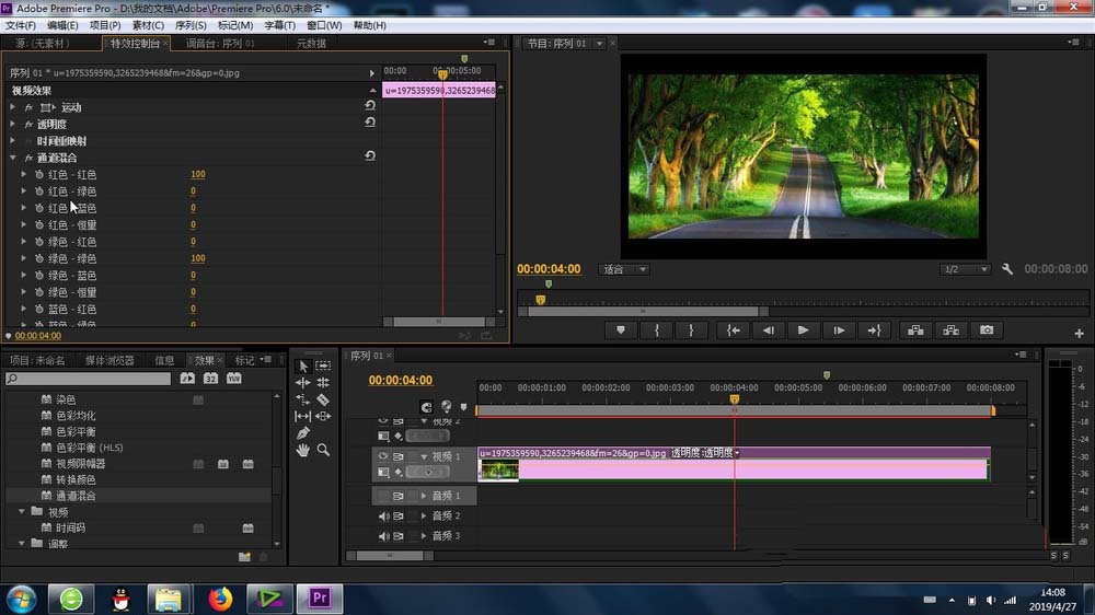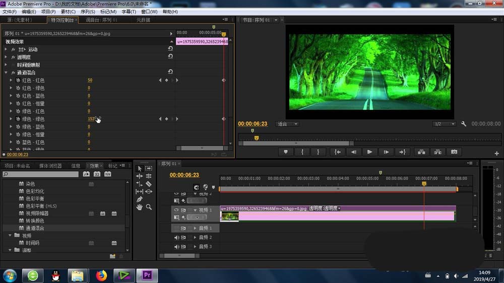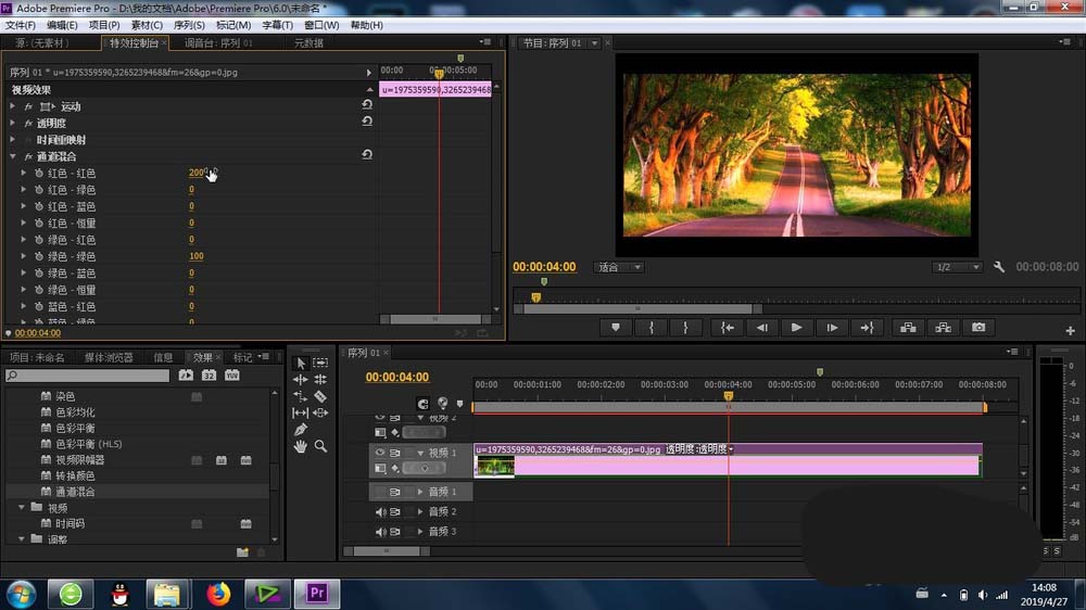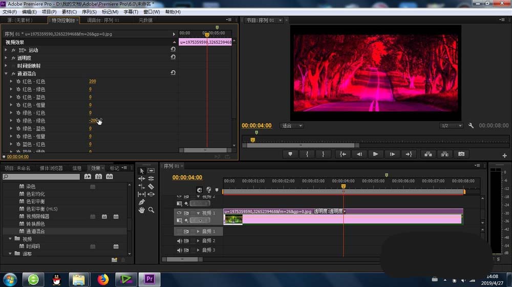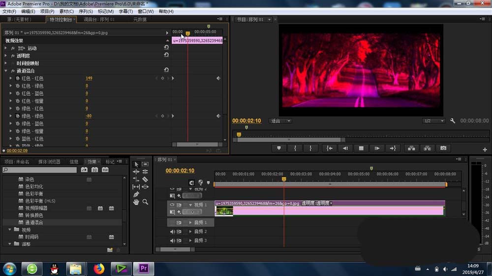 4、再有就是找到“通道混合”功能,将其添加到素材上,这样最基本的通道混合效果就产生了
