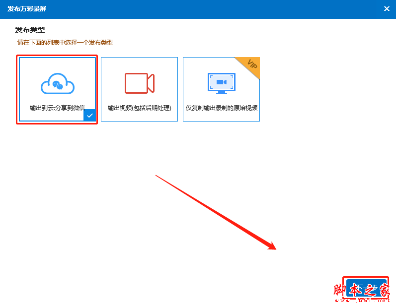 1.在首页点击“发布”,选择“输出到云:分享到微信”,点击“下一步”