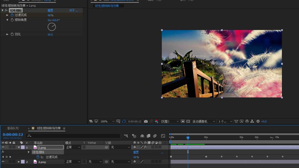 5、我们可以通过K过渡完成值来实现一个转场的效果,开始时过渡完成值为0,结束为100%。适当调整擦除角度和调节羽化值。