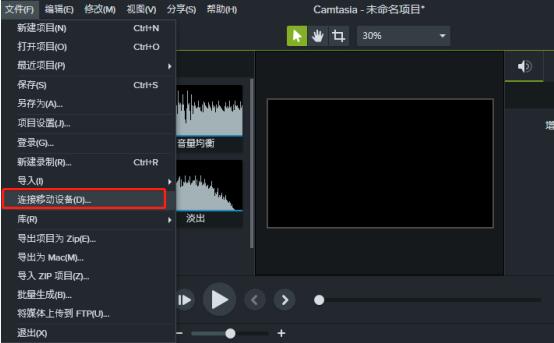 打开Camtasia Studio软件,进入界面,点击菜单栏中的【文件】——【连接移动设备】,如图,