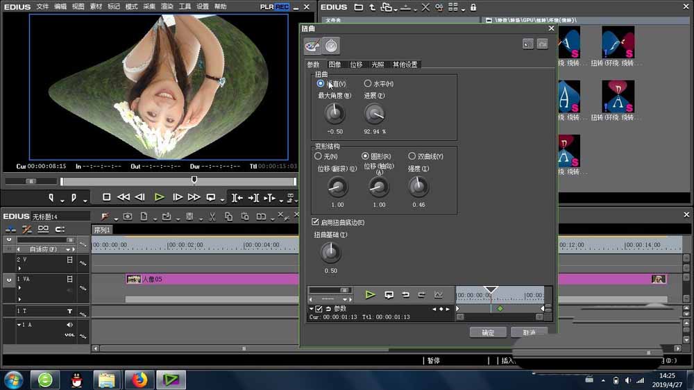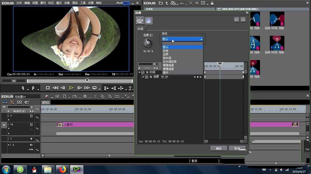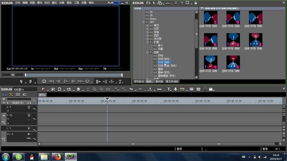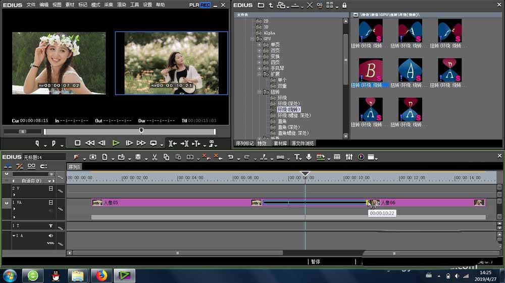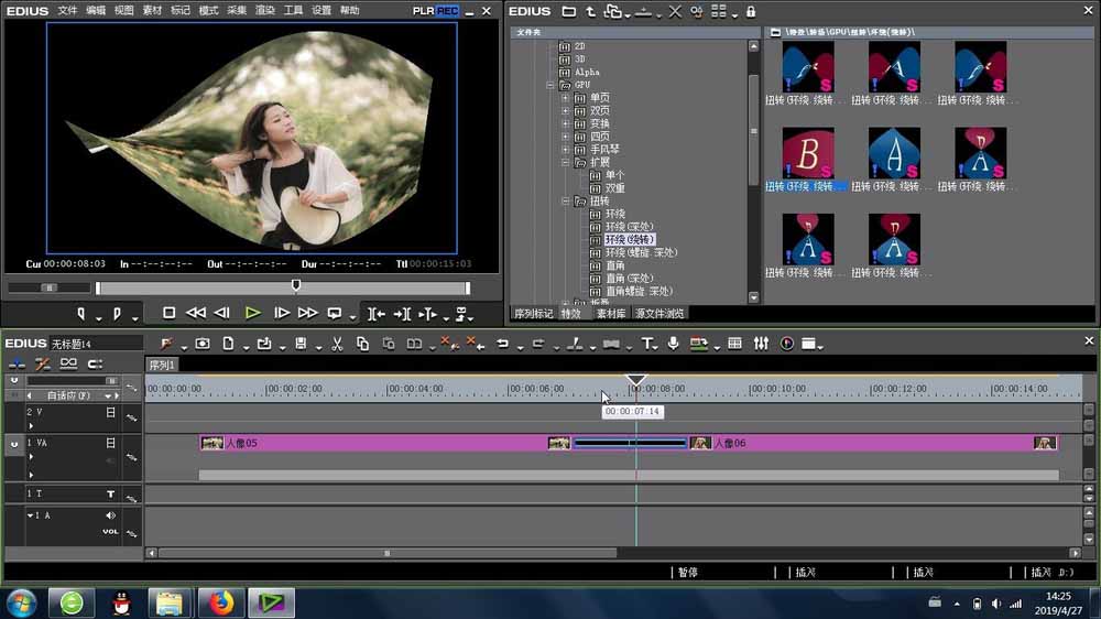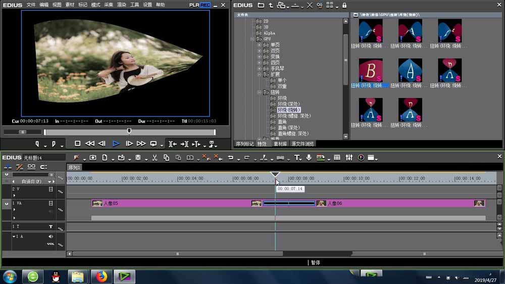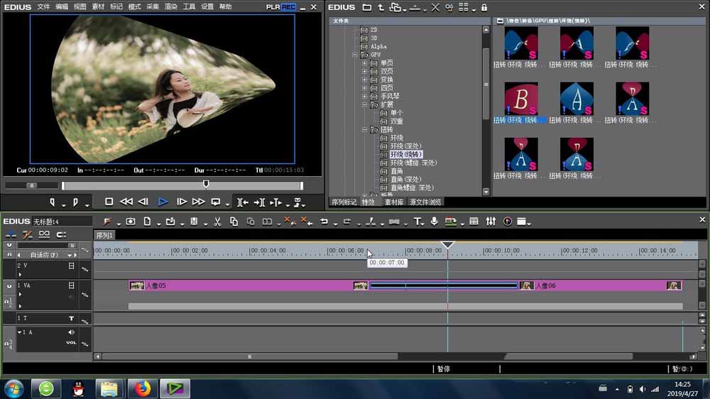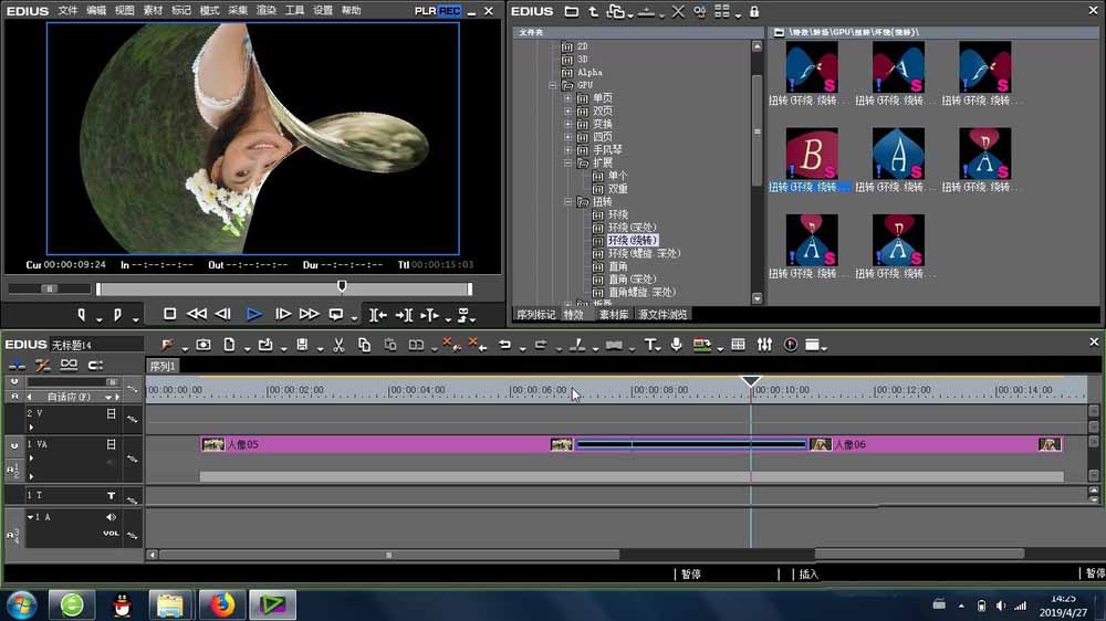 1、接下来就是扭转环绕绕转的位置是在EDIUS的特效里面,找到里面的转场-GPU-扭转 -里面,里面多种类似的效果让我们挑选。