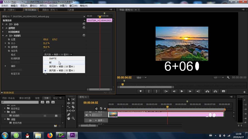 4、再有就是找到“时间码”功能,将其添加到素材上,这样最基本的时间码效果就产生了